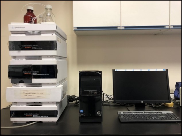 1260 Infinity LC System (HPLC) is a technique in analytical chemistry used to separate, identify, and quantify each component in a mixture. It relies on pumps to pass a pressurized liquid solvent containing the sample mixture through a column filled with a solid adsorbent material. Each component in the sample interacts slightly differently with the adsorbent material, causing different flow rates for the different components and leading to the separation of the components as they flow out of the column. It is mainly used for environmental pollution detection and monitoring.