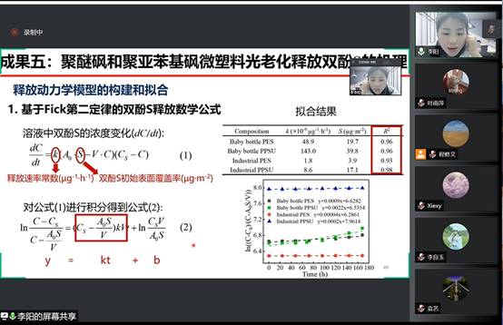 李阳教授首先从研究背景和科学问题展开,介绍了纳米材料应用现状、在水体中的迁移转化、水环境中纳米塑料发生光老化现象以及纳米塑料的聚集和沉降,并提出五种研究内容。随后,李阳教授详细阐述了主要研究进展和成果,包括金属氧化物纳米颗粒对细菌的毒性机制、DOM对富勒烯光致ROS的影响、表面涂层和化学结构对微塑料光老化的影响机理、氯离子对纳米颗粒光化学溶解的影响,聚醚砜和聚亚苯基砜微塑料光老化释放双酚S的机理、悬浮泥沙对纳米塑料聚集和沉降的影响和紫外光照对纳米塑料聚集的影响机理七个成果。最后,李阳教授对主要结论和创新点进行了总结。