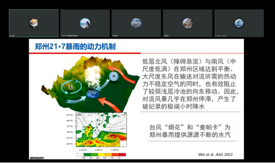 The causes of extreme weather and climate events in the context of global warming are important scientific issues of wide concern to the academic community and the public. Academician Wang Huijun first introduced the extreme weather and climate events that occurred in China in the past three years and the hazards they caused, such as the violent plum rains in the middle and lower reaches of the Yangtze River in June 2020, the "empty platform" phenomenon in South China in July and the heavy rainstorm in Zhengzhou in July 2021. Next, Academician Wang Huijun presented a detailed analysis of the causes of these extreme weather and climate events in the form of a timeline. Numerical simulation experiments were used to reveal the causes of extreme weather events in the context of global warming, taking into account the coupled sea-land-air processes. Taking the July 2021 heavy rainstorm in Zhengzhou as an example, Academician Wang Huijun integrated the influence of large-scale atmospheric circulation and mesoscale local airflow changes and topographic factors to reveal the dynamical mechanism of the Zhengzhou rainstorm and demonstrated through model simulation results that global warming had contributed to the occurrence of the Zhengzhou rainstorm. Finally, Academician Wang Huijun gave a brief summary and outlook of the presentation. He pointed out that extreme weather and climate events in China are persistent, clustered, and complex in nature, and were related to human activities and coupled sea-land-air processes; extreme weather and climate events were often high to catastrophic, with low and difficult prediction levels, and our ability to cope with these events needs to be strengthened urgently. The in-depth and colorful presentation by Academician Wang Huijun enabled the students and teachers to understand the possible links between extreme weather and climate events and elements of the Earth system, such as the atmosphere, sea temperature, sea ice, and topography, and to deeply appreciate the characteristics of the Earth system that involve the whole body.