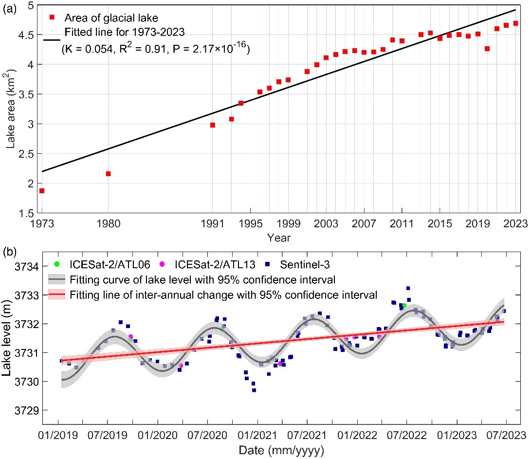 To address this, a team of researchers including Ph.D. student Wang Yingzheng, jointly trained by Lanzhou University and the Institute of Tibetan Plateau Research (ITP), CAS, and researchers Li Xin, Zheng Donghai, Professor Nian Yanyun (Lanzhou University), Associate Professor Zhou Yushan (Central South University), and Professor Tang Zhiguang (Hunan University of Science and Technology), focused on glaciers and proglacial lakes in the Ak-Shyirak region of the central Tien Shan. They used multi-source DEM data (such as KH-9 DEM, SRTM DEM, and ASTER DEM) to quantify glacier thickness changes and mass balance from 1973 to 2023 through a DEM differencing method. Using ICESat-2 laser altimetry and Sentinel-3 radar altimetry data, they quantified intra-annual fluctuations and interannual trends of Petrov Lake from 2019 to 2023, based on a periodic fluctuation model. The study also utilized EAR5-Land reanalysis data to analyze the impact factors of glacier mass balance and proglacial lake water level changes, further quantifying the contributions of glacier meltwater and precipitation to changes in lake water storage.