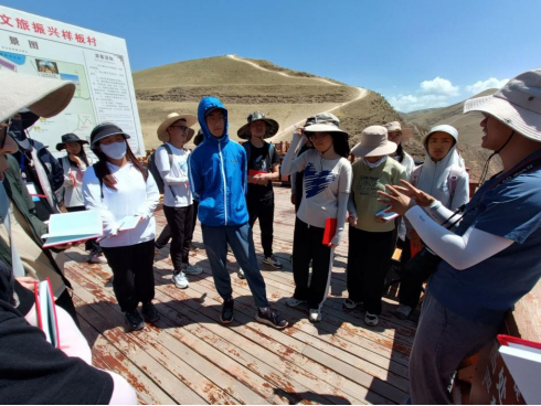 随后同学们在张老师的带领下,前往天梯山景区观景台进行观察。同学们对黄羊河水库周边山体不同颜色的岩层开展讨论。张老师指出,不同的岩层颜色代表了不同的物质组成及年代新老关系,其中,黑色岩层年代最老,红色砂砾岩次之,黄土形成年代最新。同学们进一步观察了水库的消落带,即水库季节性水位涨落使被淹没土地周期性出露于水面的区域。张老师为同学们讲解了黄羊河水库的建造以及水库的选址要素,提出要从流域整体出发,注重人地关系与可持续发展。此外,张老师由水库延伸到当地的文化历史,为大家深入浅出地介绍了中国古代西北地区的五凉文化、河西四郡的设立等历史,引发同学们的思考。
